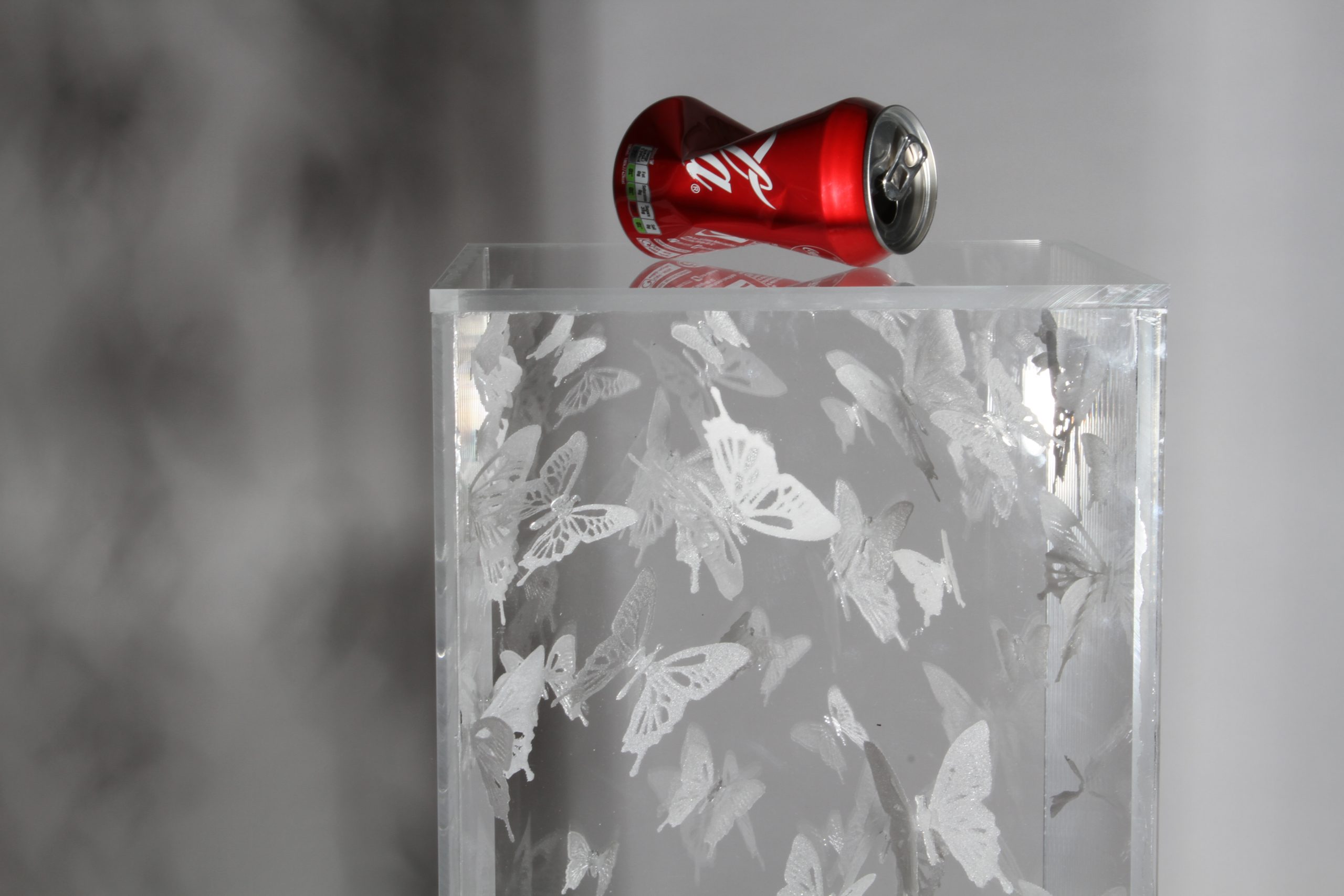 Close up of white powder glass butterflies in a glass vase on a black background by glass artist Alise Stopina