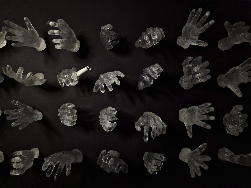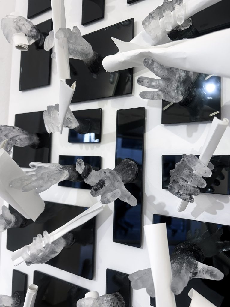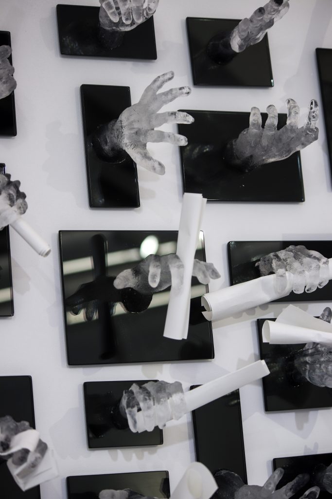 The work is made of glass cast hands, that are reaching out to hand or take a note. The hands are transparent, cold, but human. Although one is not in direct contact with the writer of the message, one still feels a human